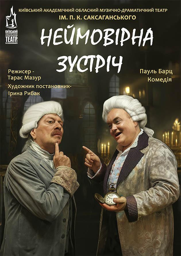 Анотація до вистави "Неймовірна зустріч" Уявіть собі, що одного вечора в епохальній кав’ярні часу зустрічаються двоє музичних геніїв. Вони живуть у різних ритмах, але з однаковим апетитом до життя, наповненого музикою і прагненням слави. Комедійна вистава "Неймовірна зустріч" — це витончений діалог, насичений гумором, пікантними фактами з минулого, між великими творцями. Кожен з них має свій рецепт геніальності. У цьому протистоянні вони намагаються знайти однозначну відповідь на питання: чи повинен художник бути голодним, щоб творити? Глядачі стануть свідками музичного двобою, в якому скрипки змагаються з сарказмом, а орган — із самоіронією. Це не просто комедія — це віртуозна імпровізація про творчість, успіх і те, як знайти гармонію між хлібом і музою. Ця вистава подарує вам нові яскраві враження!