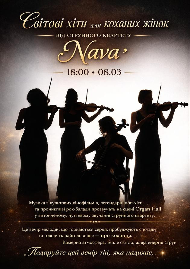 Музика з кінофільмів, легендарні поп-хіти та проникливі рок-балади звучатимуть на сцені Organ Hall у витонченому звучанні струнного квартету.